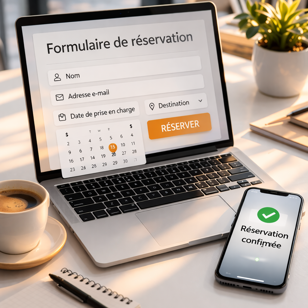Rendez-vous sur notre page de contact, remplissez le formulaire avec vos informations de trajet. Vous recevez un devis immédiat et pouvez confirmer en un clic. Pratique pour les réservations à l’avance, jusqu’à 30 jours.